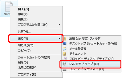 - 選択したファイルを右クリックし、表示されるメニューから「送る」−「DVD RWドライブ」の順にクリックします。