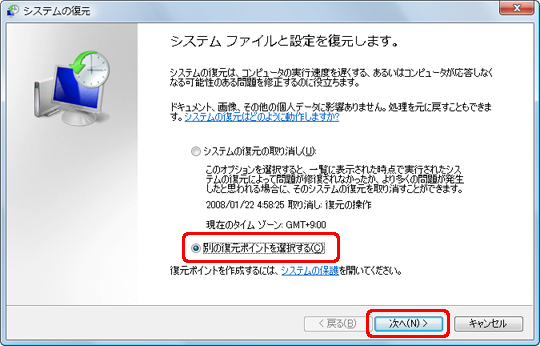 [別の復元ポイントを選択する]を選択し、[次へ]をクリックします。