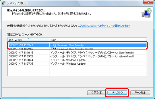 使用する復元ポイントをクリックし、[次へ]をクリックします。