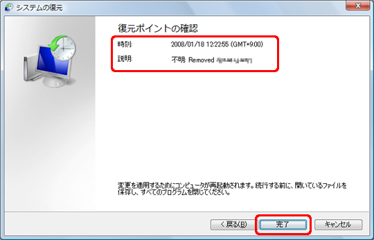 復元ポイントが正しいことを確認し、[完了]をクリックします。