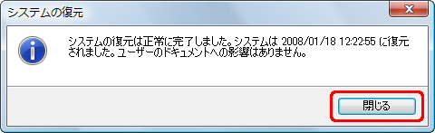 システムの復元を実行中に、パソコンを再起動します。 作業中のアプリケーションがある場合は、終了してから操作してください。