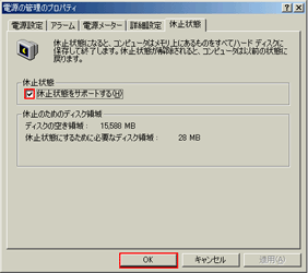 - [休止状態をサポートする]チェックボックスのチェックを外し、[OK]ボタンをクリックします。