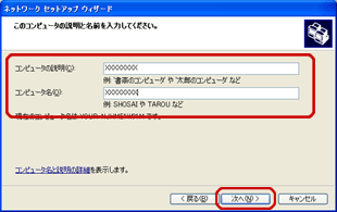 「コンピュータの説明」欄にコンピュータの説明を、「コンピュータ名」欄にコンピュータの名前を入力し、[次へ]をクリックします。