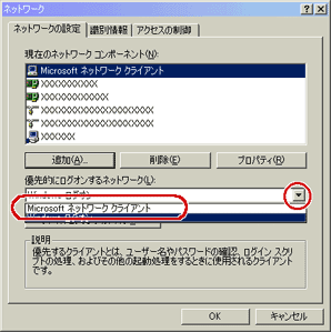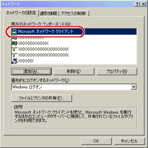 「現在のネットワークコンポーネント」欄に「Microsoftネットワーククライアント」が表示されているかを確認します。