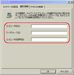「コンピュータ名」、「ワークグループ」、「コンピュータの説明」を入力します。