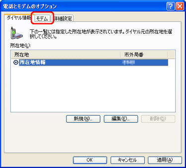 「電話とモデムのオプション」画面が表示されます。