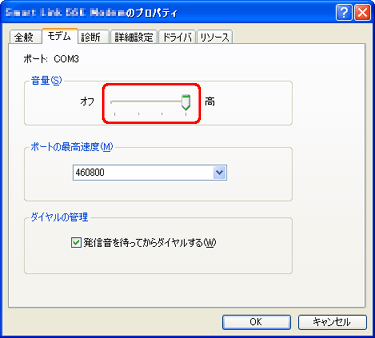 ダイヤルアップ接続時にモデムから鳴る発信音量を調節したい