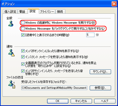 - 「設定」タブの「Windowsの起動時にWindows Messengerを実行する」/「Windows Mesengerをバックグラウンドで実行することを許可する」をクリックして、チェックを外します。