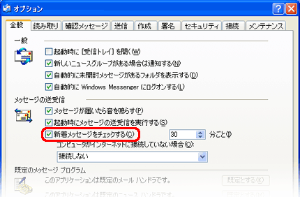 - 「全般」タブをクリックし、「新着メッセージをチェックする」にチェックが入っていない場合は、クリックしてチェックを付けます。