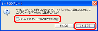 「オートコンプリート」機能を利用するかどうかの確認メッセージ「このパスワードをWindowsに記録しますか?」が表示された場合は、以下の操作を行い「オートコンプリート」機能を利用しないよう設定してください。