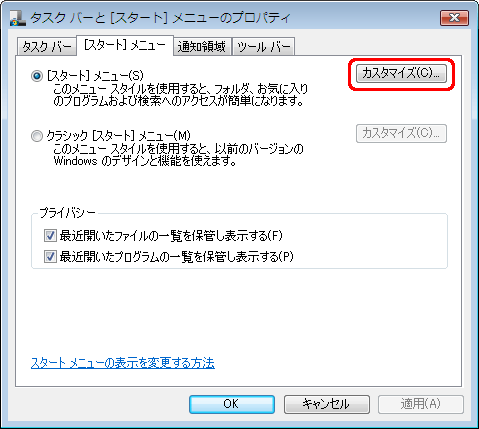 [[スタート]メニューのカスタマイズ]ダイアログボックスが表示されます。
