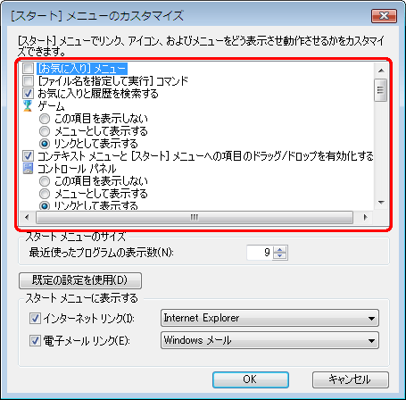 Windows Vistaのスタートメニューであまり使わない項目を非表示にするには、スタートメニューのカスタマイズで設定します。