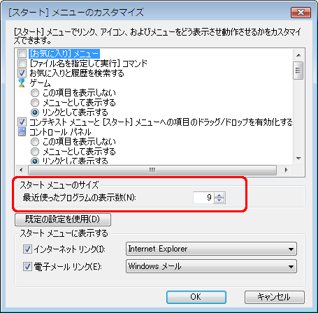 [[スタート]メニューのカスタマイズ]ダイアログボックスの「最近使ったプログラムの表示数」で、スタートメニューに表示される「最近使ったプログラム」の表示数を変更できます。