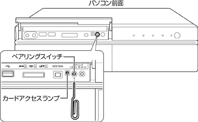 - 電源が入っている状態でパソコン前面のペアリングスイッチ(リモコン)を先の細いもの(クリップを伸ばしたようなもの)で押します。