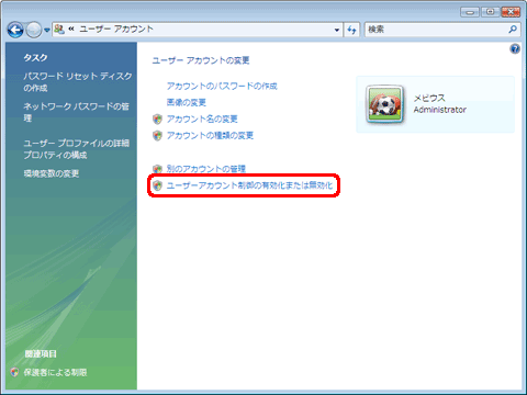 - 「ユーザーアカウント制御の有効化または無効化」をクリックします。