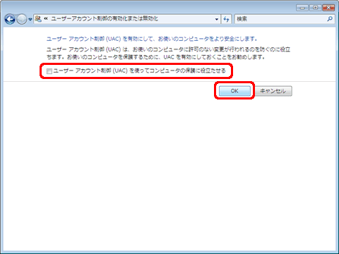 - 「ユーザーアカウント制御(UAC)を使ってコンピュータの保護に役立たせる」をクリックしてチェックを外し、