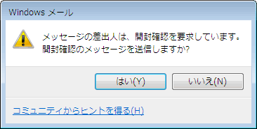 開封確認のメッセージを要求された相手のパソコンは、メールを開封すると下図のメッセージが表示されます。
