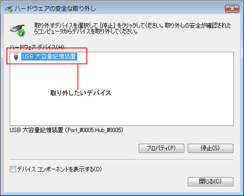 デバイスを安全に取り外すには、次のいずれかの方法で、デバイスを停止させてください。