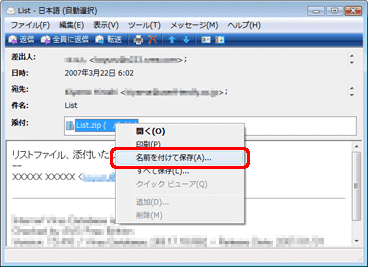 - 「添付:」欄の添付ファイルを右クリックし、「名前を付けて保存」をクリックします。