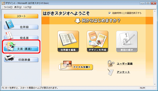「はがきスタジオへようこそ」画面から[文面(裏面)]をクリックします。