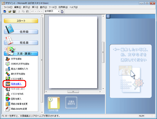 はがき文面(裏面)に選択した写真が挿入されます。
