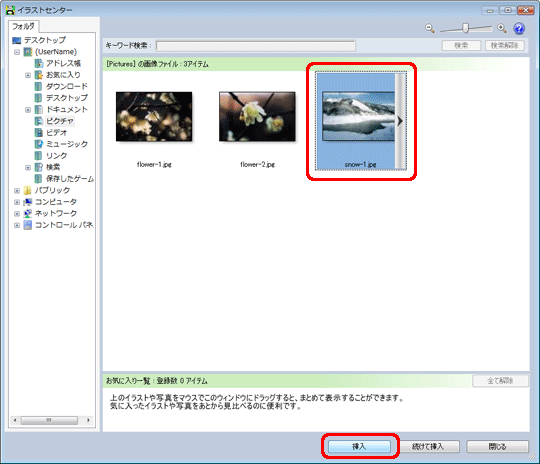 年賀状に使う写真を選択し、[挿入]をクリックします。