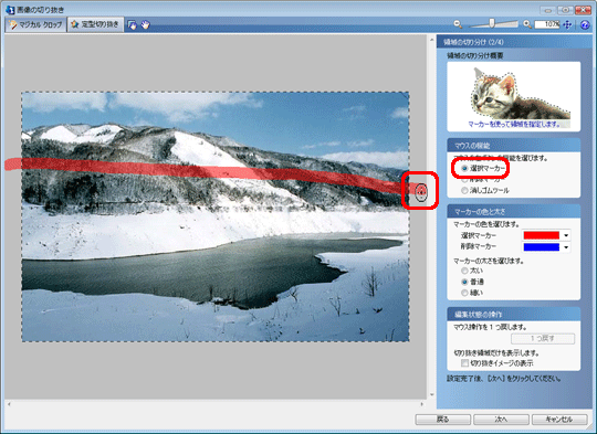 「選択マーカー」を選択し、切り抜きたい領域をマウスでなぞります。