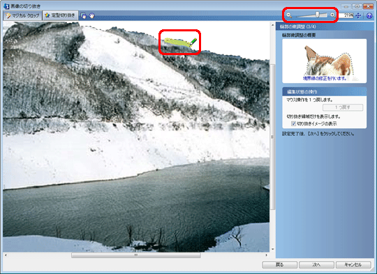 拡大ツールを使って修正したい箇所を拡大し、えんぴつ型カーソルで境界線を修正します。
