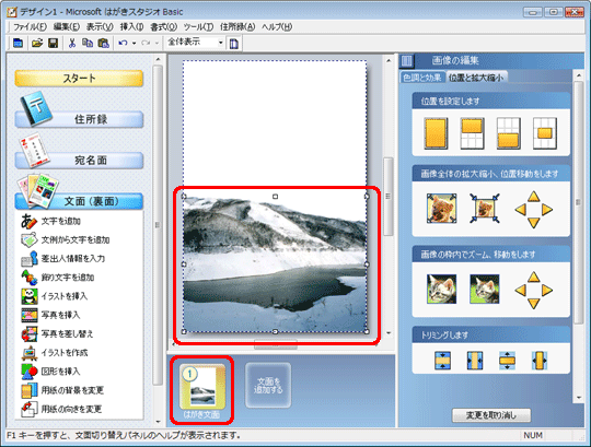 挿入した画像の位置や大きさを調整し、画面中央下の「はがき文面」をクリックして作成した文面を追加します。