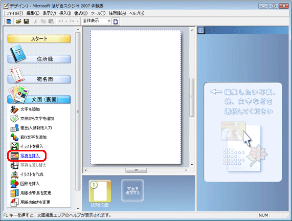 「はがきスタジオへようこそ」画面から[文面(裏面)」をクリックします。
