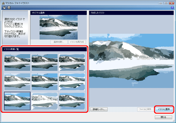 「イラスト候補一覧」から年賀状に使うイラストを選択し、[イラストに置換]をクリックします。