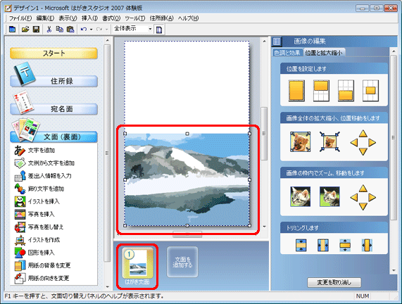 挿入したイラストの位置や大きさを調整し、画面中央下の「はがき文面」をクリックして作成した文面を追加します。