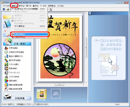 はがきスタジオ Basic 2007を使って同じデザインの年賀状を作るには、以下の手順に従って操作してください。