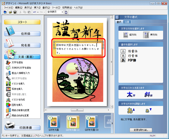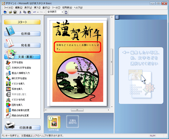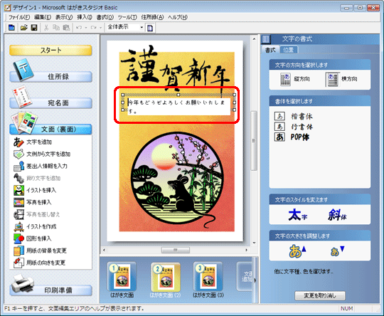 以上の操作で、同じデザインで文章だけ変更した年賀状が作成できます。