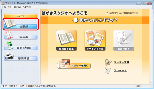 - 「はがきスタジオへようこそ」の画面から[住所録]をクリックします。