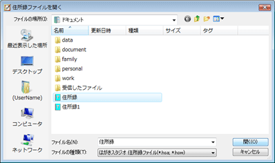 クリックして、「住所録ファイルを開く」画面で開きたい住所録ファイルを指定してファイルを開いてください。