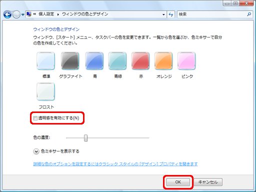 Windows Aeroの設定を有効にしたまま、ウィンドウを半透明にしたくない場合は、以下の手順に従って操作してください。