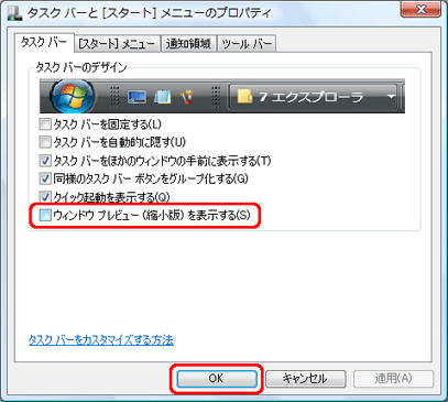 - 「ウィンドウ プレビュー(縮小版)を表示する」をクリックしてチェックを外します。
