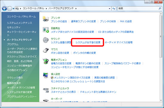 「システムが出す音の変更」をクリックします。