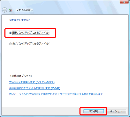 「最新バックアップにあるファイル」を選択し、[次へ]をクリックします。
