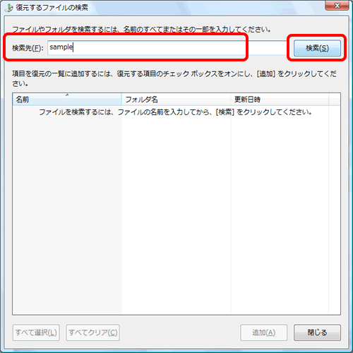 「検索先」に検索するファイル名を入力し、[検索]をクリックします。