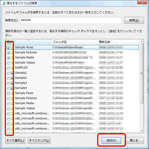 検索結果一覧から、復元したいファイルやフォルダのチェックボックスをクリックしてチェックを付け、[追加]をクリッククリックします。
