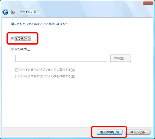 「元の場所」を選択し、[復元の開始]をクリックします。