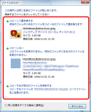 復元するファイルと同じ名前のファイルが元の場所にある場合、「この場所には同じ名前のファイルが既にあります」と表示されます。