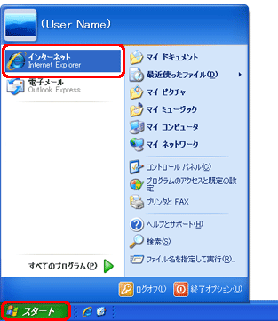- [スタート]をクリックし、「インターネット」をクリックします。
