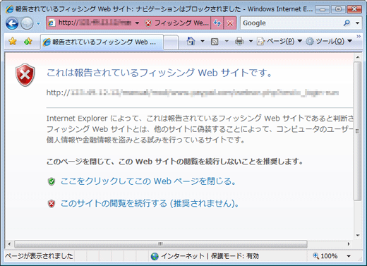 Internet Explorer 7にはフィッシング詐欺検出機能があり、有効にすると表示されているホームページがMicrosoft社に報告済みのフィッシング詐欺サイトであるかどうかを確認し、フィッシング詐欺サイトであった場合は、Internet Explorer 7のアドレスバーの色が赤く表示され、そのホームページにアクセスしないように警告メッセージが表示されるようになります。