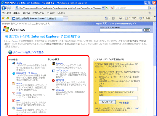 簡易(クイック)検索ボックスで使用できる検索プロバイダを追加したい(Internet Explorer 7)