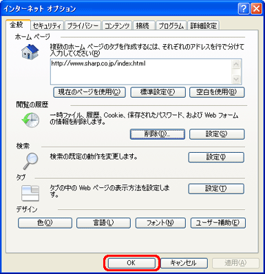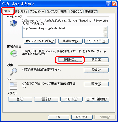 「全般」タブで、「閲覧の履歴」欄の[削除]をクリックします。