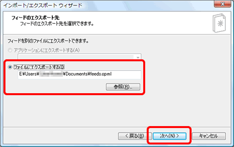 お買い上げ時の設定では、「ドキュメント」に「feeds.opml」というファイル名で保存されます。エクスポート先を変更する場合は[参照]をクリックして指定します。