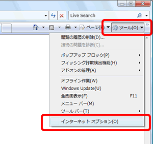 「ツール」をクリックし、「インターネット オプション」をクリックします。